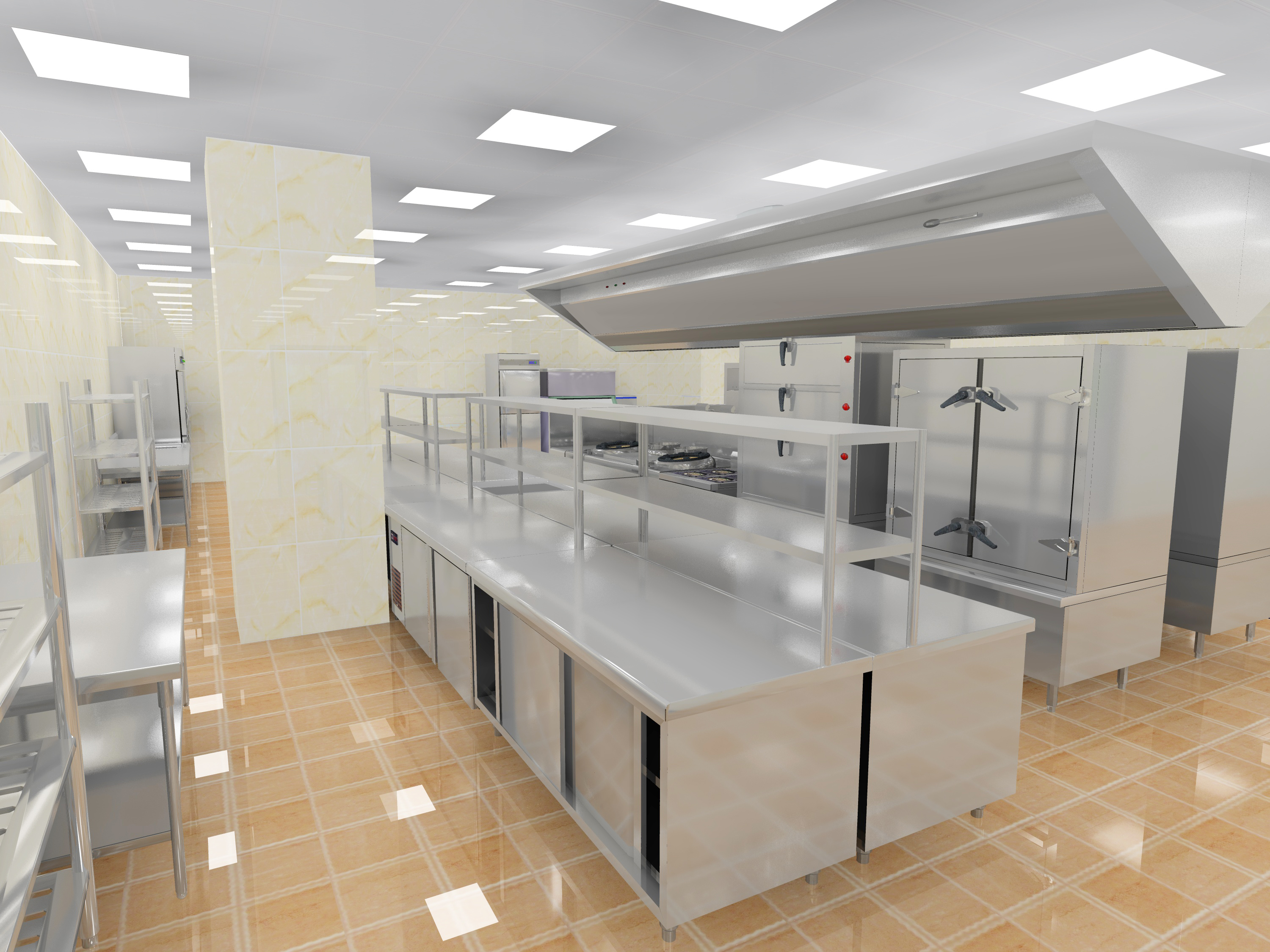 主灶間物流吞吐量最大,大量的原料、佐料、調(diào)料、餐具、用具等匯聚在這里,所以要有足夠的存儲(chǔ)空間,便于存儲(chǔ)、取放。存儲(chǔ)空間分為以下幾類:冷凍冷藏,需要存放保鮮的原料;餐具存儲(chǔ),各類潔凈餐具存儲(chǔ);工具存儲(chǔ),后廚工作人員所用的刀、叉,勺、筷、毛巾、抹布等都應(yīng)該有合理的擺放位置;臨時(shí)放置,切配、腌醬待烹制原料,所需的盆、罐、桶、盒,都要有合適的存放空間。