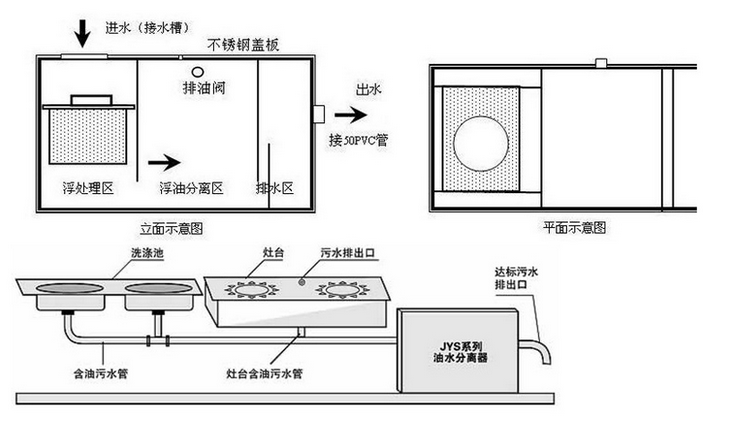 4.物理分選方法:油水分離器用于對含油廢水進行油水分離,其工作原理是通過進水口進入,過濾后去除固體殘留物,水中的油由下至上經(jīng)破乳后油水分離,然后由底部出口排出。