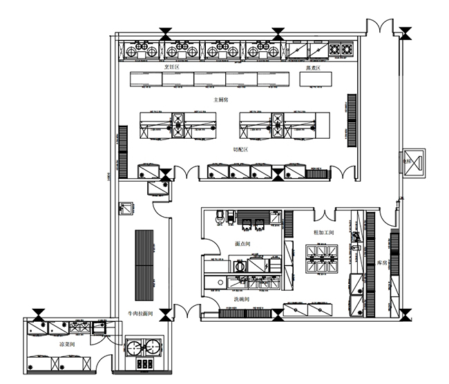 1.與一般通用廚房不同的考慮,例如,一些酒店、大食堂把明檔、開放式廚房、風(fēng)味小吃設(shè)在餐廳,增加了服務(wù)項目,也增加了廚房面積。